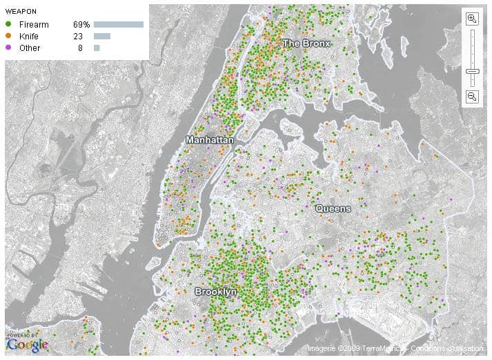 De toutes ces données, il est possible très facilement de surfer sur des résultats statistiques consolidés & présentés sur une carte (merci Google Map encore), et on y découvre par exemple qu’à New York :