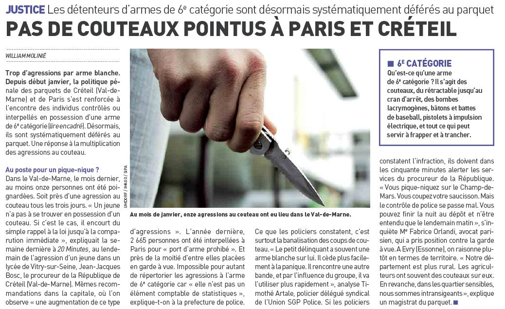 20 minutes aujourd’hui communique sur un renforcement de la vigilance et des mesures policières sur le port d’armes de 6e catégorie et en particulier des couteaux. Pour rappel, le port sur soi d’un couteau est depuis longtemps non autorisé par la loi… mais des tolérances étaient faites selon le contexte. La multiplication des agressions aux couteaux citée par l’article serait à l’origine de mesures plus radicales lorsqu’un couteau est découvert sur un individu. En somme, on se rapprocherait doucement de la situation en Angleterre où les bagarres aux couteaux ont entraîné par le passé des campagnes de communication & de responsabilisation, et une législation assez dure sur le sujet.