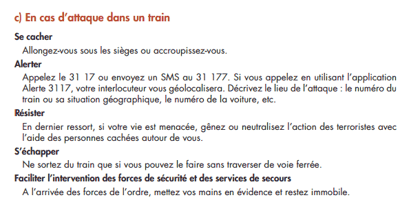 Suite aux attentats de 2015, le gouvernement avait publié une infographie « réagir en cas d’attaque terroriste » basée sur le tryptique « s’échapper / se cacher / alerter » qui avait été pas mal critiquée car inspirée du triptyque américain « run / hide / fight » de 2012, sans le « fight » (combattre, résister), et pouvait laisser supposer une forme de soumission ou de refus de la réplique violente y compris en dernier recours face à un terroriste. J’avais d’ailleurs à l’époque publié ce post.
